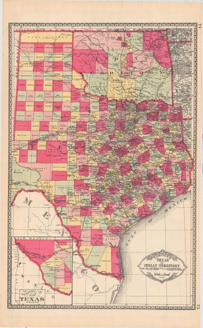 In Tunison's style, this is a finely lithographed map with original bright coloring. By this period most mapmakers had adopted printed color rather than the more labor intensive hand coloring employed here. It is decorated with a Victorian style border and title cartouche, which gives the population of Texas as 1,591,749 and no population reported for Indian Territory. At lower left is an inset "The Western Part of Texas on Reduced Scale." The panhandle of Oklahoma is Public Lands. Indian Territory is clearly divided into about 20 different Indian lands. Green County, originally established in 1860, is here unnamed and still part of Texas. It was abolished and awarded to Indian Territory by a Supreme Court decision in 1896. There is good detail of railroads with all stops located and named. Tunison's maps were printed on both sides; on the verso are single-page maps of Nebraska and Alabama.