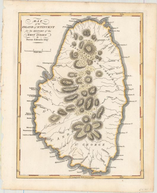 This handsome small map of St. Vincent features some nice topographical detail in the interior. The northern portion of the island is labeled Land Granted to the Charibs in 1773, referring to the land ceded to the Caribs from the British after the First Carib War ended in 1773. The remainder of the island is divided into four parishes. Towns and cities, including Kingstown, and a number of rivers are identified. Bryan Edwards was an Englishman living in Jamaica, a planter and politician who also wrote volumes about the West Indies.