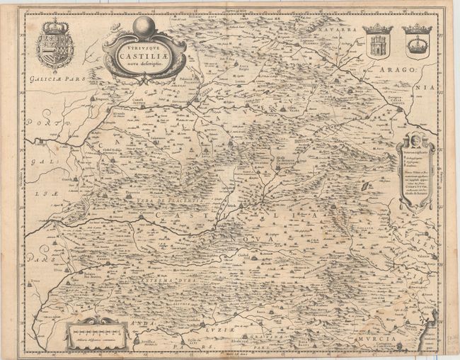 This superb map covers the heart of Spain including the cities of Cordova, Toledo, Madrid, and Cartagena. Fully engraved with mountains and forests, it is richly decorated with title and dedication cartouches and coat of arms. German text on verso, published between 1634-35.