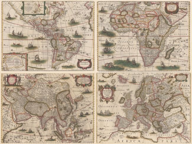 In 1630 Henricus Hondius and Jan Jansson undertook a major revision of the Mercator Atlas in response to fierce competition with the Blaeu family. This is a matching set of the four continent maps that appeared in the Atlas Novus. Latin text on verso, published between 1646-57. Size varies slightly.