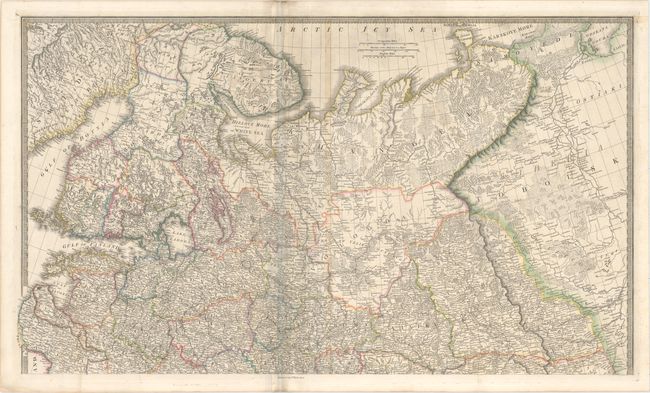 Superb, large-scale map printed on two sheets of what was then known as White Russia. The map extends north through the Ukraine to Smolensk and east to the Caspian Sea on the southern map; and includes Finland, the Arctic Sea coast, Muscovia, Archangel, and parts of Siberia on the northern map. Filled with incredible detail including the post roads, ancient ruins and interesting notations. This map was originated by Jasper Nantiat drawn from the maps of the Academy of Sciences at St. Petersburg; this edition was published by James Wyld. Size is for each sheet - if joined the map would measure 36 x 42".