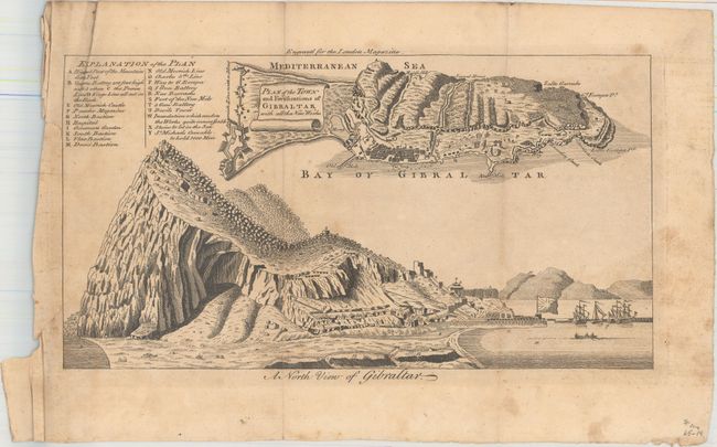 B. Plan of the Town and Fortifications of Gibraltar with All the New Works, from London Magazine, published 1762 (10.8 x 5.8"). This sheet contains a small plan at top with a key to 23 important locations. Below the plan is a view showing the imposing Rock of Gibraltar. Ref: Jolly LOND-218. Condition: Issued folding with toning, light soiling, and an edge tear at left that just passes the neatline that has been closed on verso with archival tape. (B)