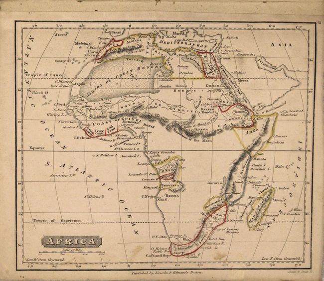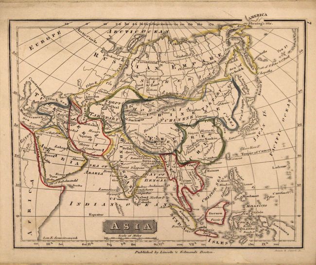 This uncommon atlas contains six single-page and two double-page copper engraved maps. Each map is well detailed and shows topography, rivers, towns and much more. The map of the United States depicts East Florida and West Florida, a large Arkansas Territory occupies present-day Oklahoma, and Missouri is identified as both a state and a territory. A large, unnamed Northwest territory occupies the region from Lake Michigan to Lake of the Woods. 8vo, original stiff paper wrappers with decorative title printed in black ink. Published by Lincoln & Edwards and "Sold by them, and by the principal Booksellers in the United States."