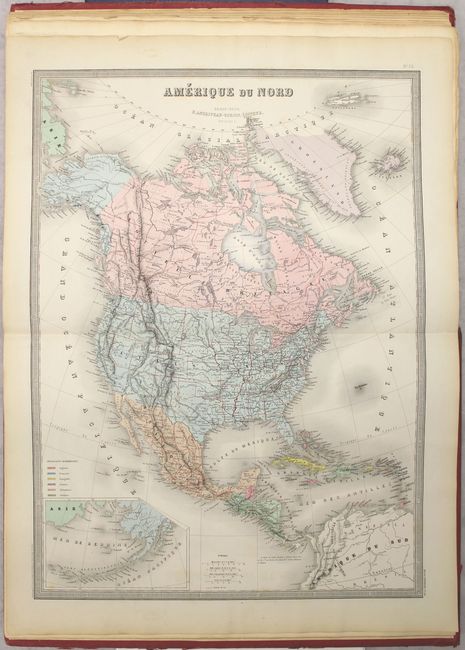 This complete atlas contains 32 double-page maps featuring the world (1), Europe (20), Asia (3), Africa (3), Oceania (1) and the Americas (4). Three maps are related to North America, including the map of the United States which is printed on two double-page sheets and features several western territories. Each of the detailed and informative maps is surrounded by a decorative border. While the volume is not dated, most maps are dated 1871-1873. Hardbound, quarter leather over red cloth covered boards with gilt title on front cover and spine.
