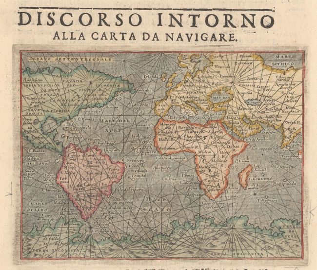This nautical world map, engraved by Girolamo Porro, was one of two world maps included in Porcacchi's popular pocket-sized atlas. It covers most of the world, excluding far eastern Asia and the western coast of North America; thus alluding to a connection between the two. The Terra Incognita landmass dominates the bottom of the map. The handsome map is filled with rhumb lines and the seas are fully stippled. On a sheet of Italian text measuring 8.0 x 11.4".