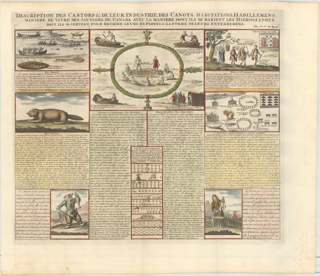 This is the famous beaver sheet from Volume Six of Chatelain's mammoth atlas. It contains descriptions and illustrations of beavers and their industry, and of the canoes, dwellings, hunting, fishing, clothes, customs and writing of the Canadian Native Americans. The part of the text entitled Amors & mariages des sauvages details how the prospective groom would woo his bride, which is also illustrated above. The large and pointy-toothed beaver is recognizable in later cartouches by Robert de Vaugondy, Santini and others.