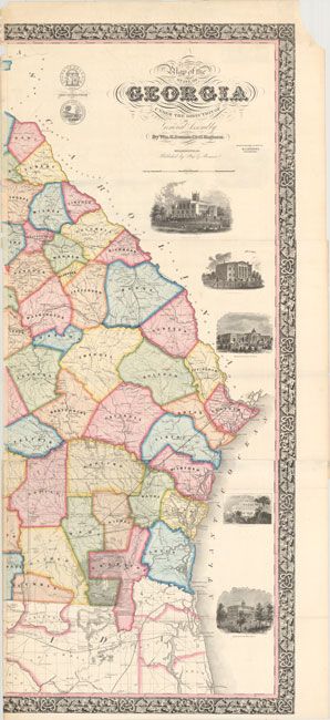 Bonner built his map primarily based upon existing information available at the then-state capital of Milledgeville. He also gathered important data from county officials, and this local flavor shows up in the place names he chose to include on the map like those of churches, schools, academies, courthouses, mills, grave sites, and more. Northern Georgia and western Carolina were the site of the first American gold rush which started in the 1820s-30s, and several place names elude to gold including Franklin Mines, Glade Mines, as well as a Marble Quarry. The U.S. Mint, established in 1835, is also shown within the gold region next to Dalhonega in Lumpkin County. A very small Atlanta is shown here at the intersection of three railroads - the Georgia Rail Road, Atlanta & West Point, and the Western & Atlantic. The map also highlights the recent boundary dispute with Florida, and depicts three different boundary lines by McNeil, Butts, and Crawford & Cooper. The boundary was settled at McNeil's line (Florida's claim) by the U.S. Supreme Court in 1854. Surrounding the map are 8 vignettes: Tuccoa Falls; Franklin College, Athens; Stone Mountain; Capitol at Milledgeville; Executive Mansion; Asylum for Lunacy Midway; Female College, Macon; Academy for the Blind, Macon. Drawn on an impressive scale of 6 miles per inch. The map consists of 6 sheets that have been joined into two. If completely joined, the map image would measure approximately 53 x 62". Printed by Rufus L. Barnes in Philadelphia.