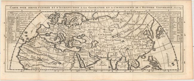 C. Carte pour Servir d'Entree et d'Introduction a la Geographie et a l'Intelligence de l'Histoire Universele (14.6 x 5.4"). This map of the Ancient World spans from the British Isles east to Japan and south to central Africa. Tables at left and right key 32 locations to the map. Condition: Light offsetting. (B+)