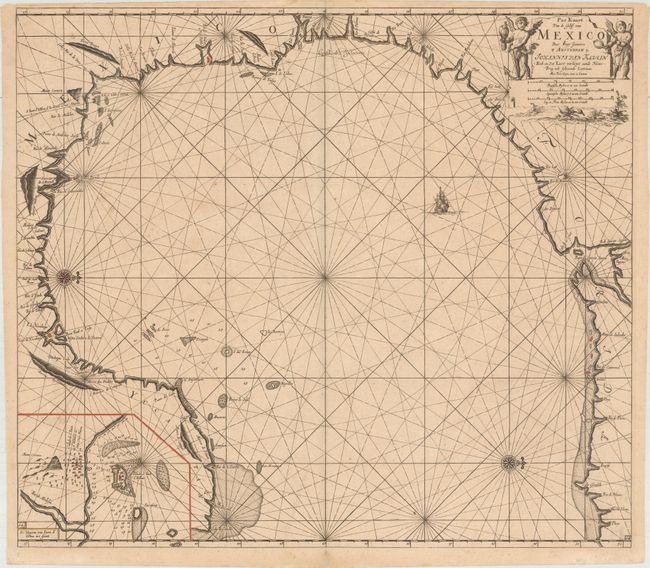 Two compass roses orient this stunning chart with north to the right. It covers the western portion of the Gulf of Mexico, stretching from the panhandle of Florida around to the Yucatan peninsula. Van Keulen's chart was mostly derived from an exceedingly rare chart by Hessel Gerritsz, c. 1631. Of note, the panhandle of Florida lacks any familiar form and the Baja de Spirito Sancto represents the mouth of the Mississippi River. An inset at lower left shows the seaport of Vera Cruz and the island Fort of San Juan d'Ulloa. The chart was engraved by the eminent geographer and mathematician Claes Janszon Vooght. It originally appeared in Johannes van Keulen's fourth volume of the Zee-Fakkel in 1684. This is the third of four states with shoals added off the coasts of Florida and the Yucatan peninsula.