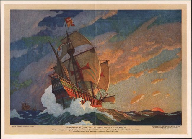 This complete set of two maps and three prints is based upon the five murals created by painter N.C. Wyeth which decorate Hubbard Memorial Hall, the National Geographic Society's first formal library. While the maps themselves are based upon modern information and political boundaries, the style and decorative elements are characteristic of 16th century maps including depictions of Zeus, Poseidon, a wind head, and several explorers. The three prints beautifully depict Columbus on uncharted seas, his discovery of the New World, and Richard Byrd's flight to the North Pole. The murals were part of National Geographic Magazine's "The Romance of Discovery", and these prints served as the frontispieces to the March, May, July, November and December 1928 magazine issues.