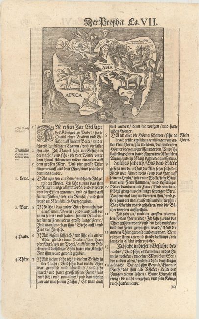 This unusual little map is also known as the Wittenberg world map. It represents Daniel's interpretation of King Nebuchadnezzar's dream. This prophecy from Chapter 7 of the book of Daniel speaks of "the four winds of the heaven … and four great beasts [which] came up from the sea." The barely recognizable continents of the Old World - Europe, Asia and Africa - are depicted with the four beasts of Daniel's dream. The world is surrounded by wind heads in a blustery sky and a stormy ocean. Theologians at Wittenberg interpreted this dream as a foretelling of the victory of the Turks at the Battle of Mohacs in 1526, and the image remained popular for several decades thereafter. The map first appeared in a commentary on the prophet Daniel by Martin Luther in circa 1529, and is often attributed to the printer Hans Lufft. This example is considered the 2nd version of the map. Published in a German bible Die Propheten Alle Deudsch in Wittenberg, printed by Lorenz Seuberlich from 1599-1610. On a full sheet of German text measuring 9.4 x 15.2".