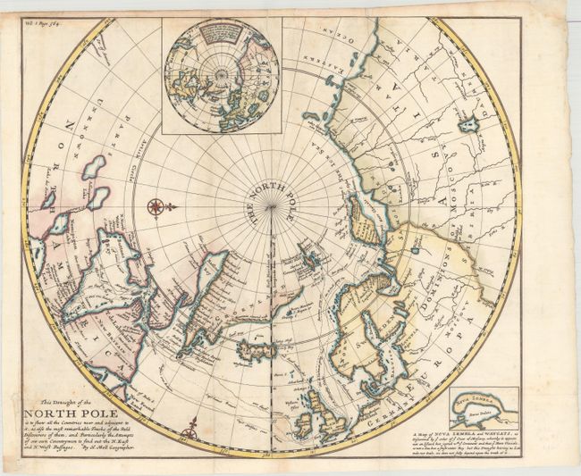 Boldly engraved chart of the polar region to 50° N. shows the latest discoveries and routes of numerous explorers during their attempts to find a Northwest and Northeast Passage, including James, Hudson and Barentz. Baffin and Hudson Bays are shown in a rather narrow configuration. Novaya Zemlya is shown correctly on the map as an island, but shown as a peninsula in a small inset with a disclaimer by Moll. The only note on the Pacific coast is that of the Str. of Annian. A second inset shows a north polar projection with the island of California, and notes regarding the destinations of explorers who were searching for a northern passage to Asia.