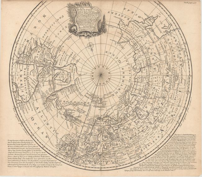 A highly detailed map that shows the tracks of navigators in their numerous attempts to find a northern passage to the economic riches of Asia. The map shows great information on the hunt for the Northwest Passage via Hudson Bay. Much of Greenland and the western part of North America remain undiscovered. A decorative title cartouche obscures the unknown northwest coast. Panels of English text at the bottom describe the explorations and probabilities of finding a Northwest Passage via Hudson Bay, with particular interest in the outcome of the 1746 Arthur Dobbs expedition.