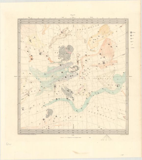 A. [Disbound] Six Maps of the Stars, by SDUK Society for the Diffusion of Useful Knowledge, published 1831, black & white (13.7 x 16.2"). This matching set of steel engraved celestial charts was produced by W. Newton from the catalogue of the Astronomical Society and revised by Rev. William Rutter Dawes. The six charts include two circumpolar and four centered on the solstices and equinoxes. They are presented on the gnomonic projection and include all the stars up to the sixth magnitude, or those that can been seen with the naked eye. The maps show the influence of both Pardies and Flamsteed. The geocentric constellations are shown in allegorical forms that were designed by W. B. Clarke, engraved by J. & C. Walker and published by Baldwin & Cradock. Included with the charts is the title page. Reference: Kanas #6.4.4.6. Condition: Light to moderate scattered foxing and minor toning. (B+)
