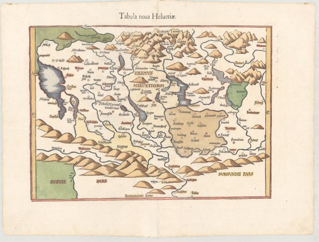 This fine woodcut map is one of the earliest modern maps of Switzerland. It was reduced from Waldseemuller's 1513 map from the first modern atlas based on contemporary knowledge. The map is oriented with north at the bottom of the sheet.