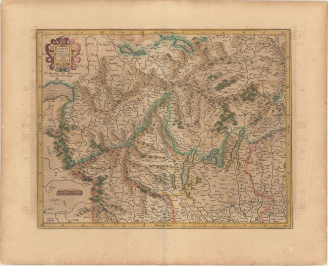 Handsome map of the mountainous Lombardy region of northern Italy and portions of southern Switzerland with the glacial lakes of Maggiore, Lugaro and Como roughly in the center and Lake Geneva to the left. The map is simply ornamented with a strapwork title cartouche and a block-style distance scale. Latin text on verso.