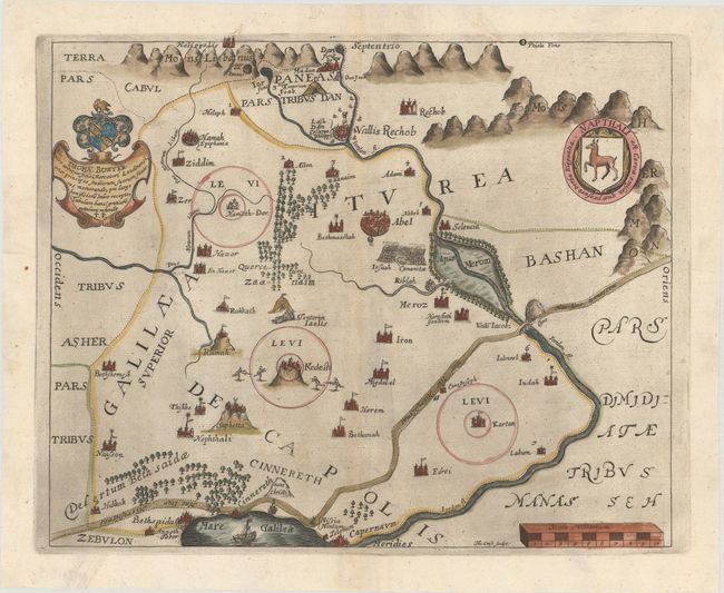 This delightfully illustrated map covers the territory of Napthali, one of the twelve tribes of Israel. Bounded by the Lebanon Mountains in the north to the Sea of Galilee, the map is roughly centered on Kadesh, its most prominent town and the Jordan River is prominently depicted. The map is filled with pictorial illustrations and is embellished with a coat of arms and dedication to Thomas Bowyer and the shield of the Tribe of Napthali. Engraved by Thomas Cross.