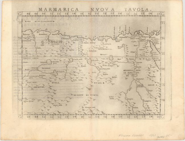 Great Ptolemaic map of eastern Libya and Egypt with a number of ancient place names, particularly along the course of the Nile. The map extends east to the Red Sea and shows spurious lakes and rivers in northern Africa. Italian text on verso, published in 1561 or 1564.