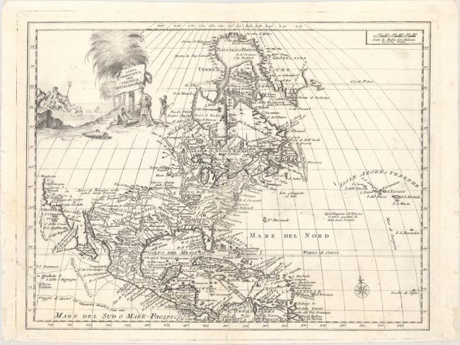 This is Albrizzi's version of Delisle's landmark map of North America. It is nearly identical to the Delisle map with California returned to its peninsular position rather than as an island. C. Mendocin is the farthest northern point on California, and the north portion of the continent is left blank. The tracks of Cortez, Drake and Olivier are noted in the Pacific, and the Great Lakes are well-defined, based on Coronelli. The English settlements are confined east of the Alleghenies and the Spanish forts are clustered around Santa Fe, here shown as a large fortification. The Mississippi River Valley is delineated with French forts located, including F. St. Luigi (St. Louis).