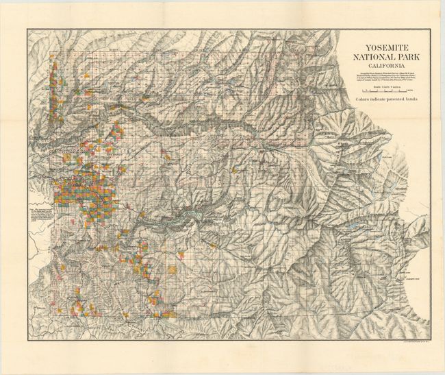C. Yosemite National Park California, by U.S. Government, circa 1898, printed color (13.9 x 10.7"). Beautiful stone lithographed map has fine color overprinting to indicate patented lands. It extends to Deadman's Pass in the east; locates White Wolf, Bald Mountain, and various high mountain lakes to the east. Yosemite Valley is at the center with rock formations named. Condition: Clean and colorful with just a hint of toning along the folds. (A)