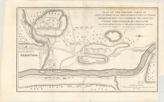 This detailed map illustrates the historically important Revolutionary War engagement at Saratoga in October 1777, which ended in an important victory for the Americans. The map details the area around Saratoga and to the north along the Hudson River and locates Fishkill Creek, the ruins of Old Fort Hardy, the British Army headquarters, positions and entrenchments, artillery, and much more. The map was drawn by Isaac Chapman from an original sketch by an unnamed American officer. The map was engraved for the Analectic Magazine by G. Fairman and published by Moses Thomas of Philadelphia. A rarely offered battle plan from this seldom seen Philadelphia-based magazine.