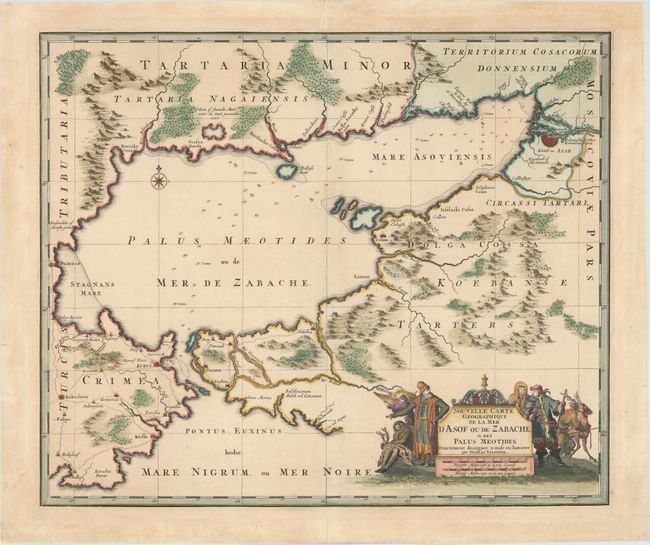 This rare chart of the Sea of Azov and the surrounding area was published around the time of the Azov Campaigns, in which Peter the Great led two Russian military campaigns to capture the important Turkish port city of Azov. The Russians were successful, and were finally able to reach the Sea of Azov and the Black Sea in their attempt at becoming a maritime power. The city of Azov is prominently depicted at top right. The map is handsomely adorned with a title cartouche featuring several Russian figures and deer hunters.