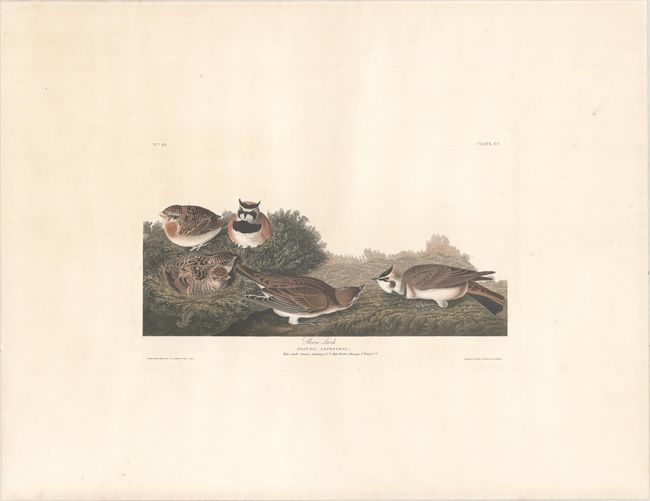 This original aquatint is Plate 200 from the double-elephant folio Havell edition of Audubon’s great work on American ornithology, which is the most important ornithological work produced in America. The complete work was produced in less than 200 copies. Audubon traveled throughout the U.S. and recorded 435 life-size images of every native bird in the country, depicting them in natural poses in their native habitats. This engraving depicts several Shore Larks (now commonly known as Horned Larks), including a male and a female in summer plumage, a male in winter plumage, and three young chicks. Audubon drew three young Shore Larks during a trip to Labrador in the summer of 1833. Engraved, printed and hand colored by Robert Havell. The papermaker's watermark "J. Whatman 1837" is in the bottom left corner of the sheet. The full sheet measures 32-3/8 x 25-1/16".