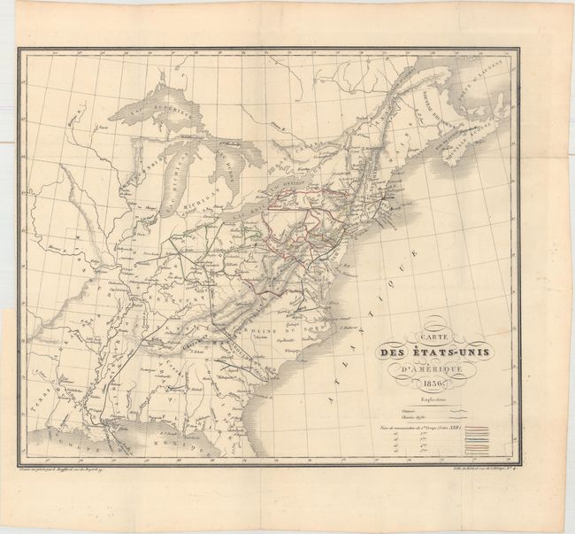 This elegantly engraved French map of the developing United States spans from northern Florida to Nova Scotia and west past the Mississippi River. The most prominent feature of the map is the evolving transportation network, with canals and railroads color-coded into five regional groups. The National Road is depicted from Cumberland to Vandalia, and two projected railroads are shown from New Orleans to Nashville and from Charleston to Cincinnati. Lithographed by Benard and published in Michel Chevalier's Lettres Sur l'Amerique du Nord. Chevalier was commissioned by the French Interior Ministry to study the American transportation network from 1833-35.