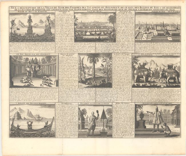 This striking sheet includes 9 engravings related to Thailand, including a view of Ayutthaya, the capital of the Kingdom of Siam, the royal ship, the king mounted on an elephant, various plants that can be found in Thailand, and typical costumes. Each engraving is accompanied by descriptive text in French.