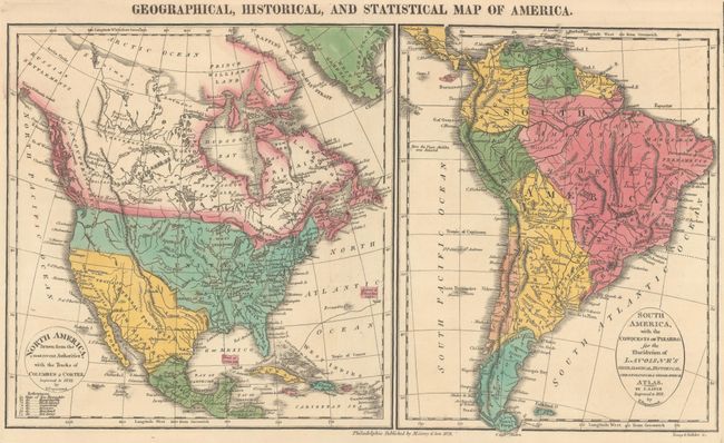 Two maps on a large sheet surrounded by text. The map of North America is about 8 x 9" and South America is 7 x 9". The United States extends to include the unnamed Oregon Territory. The large Arkansas Territory extends to Mexico on the Red River. Mexico, "Internal Provinces", encompasses Texas, the Southwest and California. Alaska is not shown, but the map names Pr. Williams Sound. The surrounding text gives much information on the climate, history, and discovery of the Americas. This is Carey's third Philadelphia edition. With text measures 20.5 x 16.7".