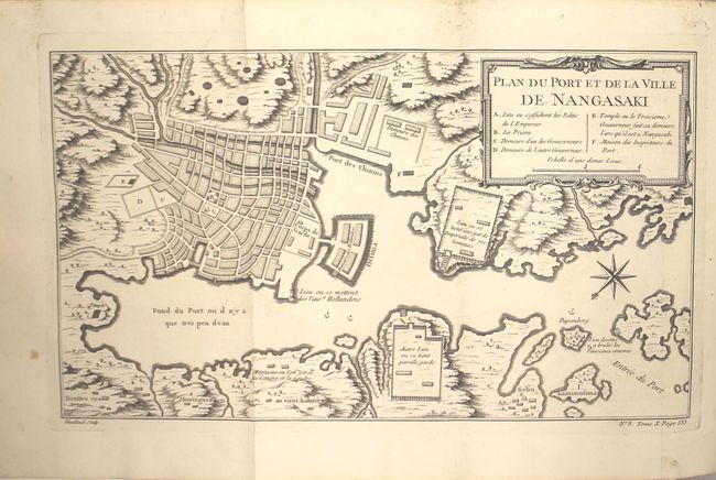 Plan du Port de la Ville de Nangasaki (13.2 x 7.3"). Bellin's smaller version of this great plan of Nagasaki. The map is oriented to the southwest with a bold compass rose. The map locates the principal points of interest and major buildings. The Desima is central to the map. This artificial island in the bay of Nagasaki was where the VOC (Dutch East India Company) were allowed to trade with the representatives of the Shogun in Edo. Locates a large Temple complex at the end of the bay. The rococo-style title cartouche incorporates the key to locations.