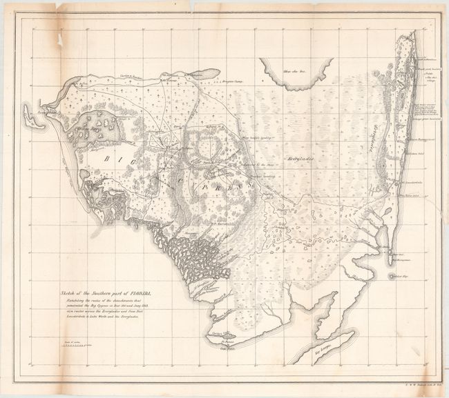 This rare Second Seminole War map details military activity south of Lake Okeechobee during the winter of 1841-42. The map traces the routes of Captains Wright, Wade, and Childs through the Everglades. It identifies a number of forts and villages, a Field burnt by the Navy, the site of a skirmish, and much more. A note along the eastern coast reads, "Capt. Wade's command of 84 men were 5 days hauling their canoes, 17 in number, across the marsh from the Orange grove haulover to Lake Worth." There is fine topographical detail in the Big Cypress and Everglades.