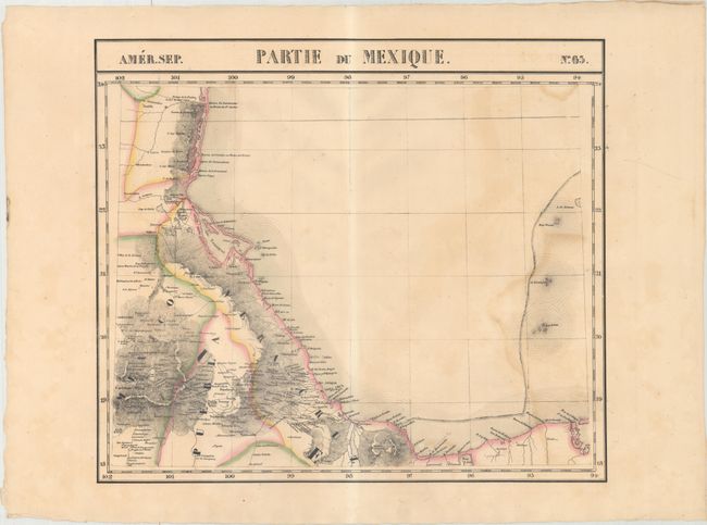 This uncommon map covers the east of coast of Mexico and inland to include Mexico City. The information was gathered from Spanish sources and Humboldt’s Carte Generale...Nouvelle Espagne (1809). The Atlas Universel was the first atlas to present all the maps on the same scale (1: 1,641,836) about one inch to 26 miles, with each map covering an area of approximately 10 degrees longitude (from Paris) and 6 degrees of latitude. It is also considered to be the first lithographic atlas ever published. The maps were meant to be joined together to form a huge globe measuring 7.775 meters in diameter. Only one edition of the atlas was published in 1825-27, and the subscription list shows that just 810 copies were sold; thus the maps are very scarce on the market today.