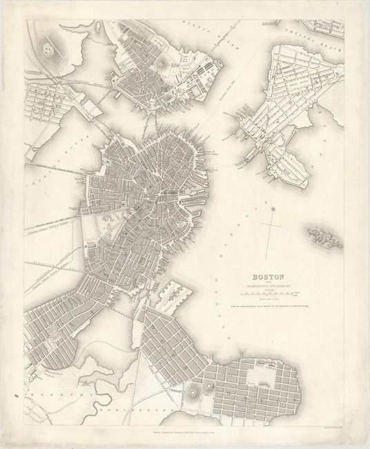 Detailed steel engraved plan of Boston and the surrounding cities prior to the filling of the Back Bay. Major railways are shown including the Providence Railway, Worchester Railway, Charleston Branch Railway, Lowell Railway, and the Eastern Railway. Other details include historical landmarks, hospitals, parks, and more. Engraved by B.R. Davies and published by Chapman & Hall.