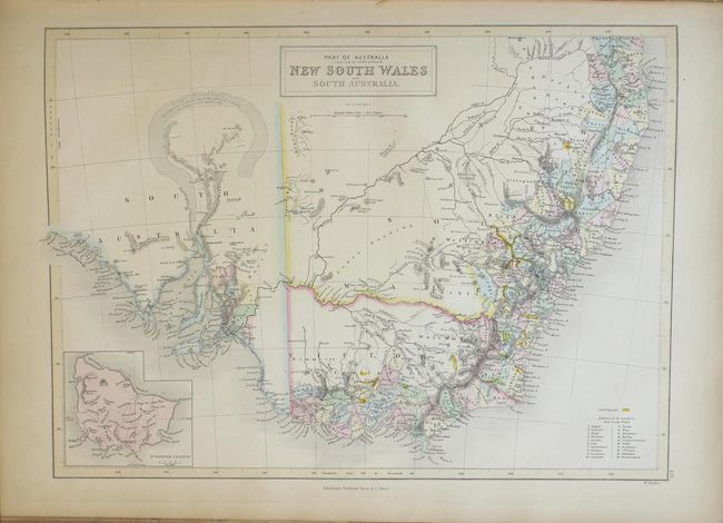 This complete atlas contains 7 thematic charts and 56 maps (16 double-page) in all including the world (4), ancient world (2), Americas (10), Asia (8), Africa (4), Australia (3), and Europe (25). Of U.S. interest are maps of North America, the United States (eastern only), Mexico, and an unusual Arctic Regions and British America. The atlas also contains nice maps of southern Australia, New Zealand, and a lovely Mountains and Rivers plate. Full contents include title page, table of contents, list of maps, 12 page introduction, maps, and a 63 page index. All of the original tissue guards are in place in this nice example. Rebound in quarter leather and tips over red cloth with gilt tile on front cover and spine. Engraved by Sidney Hall and published by Adam & Charles Black in Edinburgh.