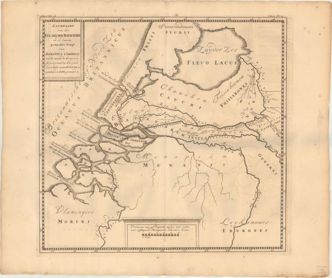 This map of ancient Holland depicts the Island of the Batavians and the Canal of Domitius Corbulo. This is one of several maps of the 16th-18th centuries that illustrate the theory that there was a link between the Dutch and the Batavians, who were thought to be a very developed people inhabiting parts of the Rhine Delta in Roman times. Decorated by a simple block-style title cartouche and distance scale on a plinth.