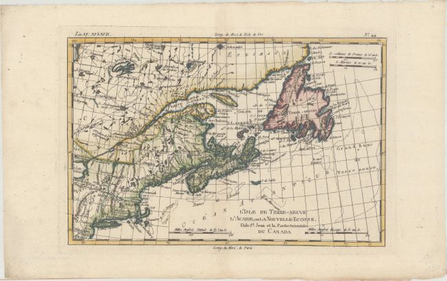 Copper engraved map of the Maritimes as far west as Lake Ontario, as well as New England and the Atlantic coast to Philadelphia. The map is detailed to show the provinces, towns, forts, harbors, Indian tribes, and the fishing banks in the North Atlantic. According to Kershaw, this is an anonymous derivative of Bonne's map.