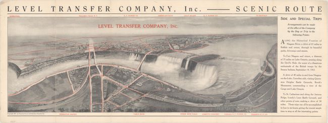 D. [Lot of 2] Level Transfer Company, Inc. Scenic Route Around the Niagara Gorge, by the Niagara Falls Automobile Transit Co., dated 1907, printed color (19.9 x 7.1") and E. Niagara's Great Gorge Trip - The Falls and Whirlpool Rapids Route..., by Niagara Gorge Railroad Company, dated 1928, printed color (31.1 x 7.6"). These two brochures feature folding lithographs of the Niagara Falls Gorge. The first lithograph highlights scenic automobile routes in red overprinting, while the second advertises a close-up view of the Falls via railway as "there is no automobile road through the gorge." Both versos contain illustrations and related text. Condition: There are a few minor fold separations confined to the blank margins and light wear along the fold lines. (B+)