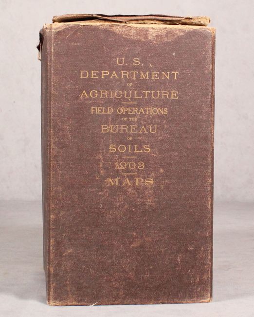 Housed in a partial brown cloth case, this complete set contains 79 large folding maps (the set calls for 78 but includes a duplicate of #32) from the 5th Report of the Field Operations of the Bureau of Soils, under the direction of Milton Whitney. Each of the maps has a legend identifying the various soil profiles which are overlaid on base maps provided by the Geological Survey. In addition to the soil types, the maps depict roads, railroads, cities and towns, county boundaries and topography via contour lines. This is one of the most desirable atlas volumes as it contains two maps of Los Angeles (#77 & #78), one of San Jose (#72), and several of Louisiana including New Orleans (#21). The full list of maps include: