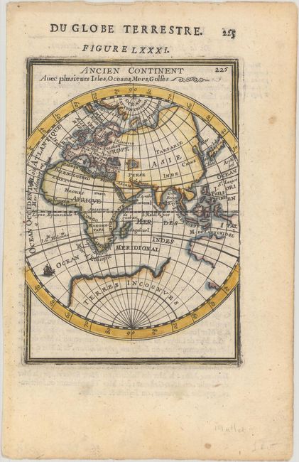Matched pair of maps of the hemispheres. In the Western Hemisphere, California is shown as an island and there are several disembodied coastlines in the Pacific and the region labeled Terres Australes. In the Eastern Hemisphere, Australia is still in a conjectural form and there is a partial coastline of the southern continent labeled Terres Incognues. A tiny galleon decorates the Eastern Hemisphere map. French text on verso.