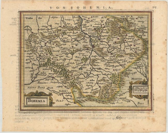 An attractive small map of Bohemia with Prague near the center. It is boldly engraved in Mercator's style with mountains, forests and scores of tiny villages and is graced with a pair of strapwork cartouches. German text on verso. This map is very rare as it only appeared in the last two editions of Jansson's Atlas Minor in 1648-51. Although almost nearly identical to the earlier plate, this plate is differentiated by the absence of coordinate figures and wind directions in the border.