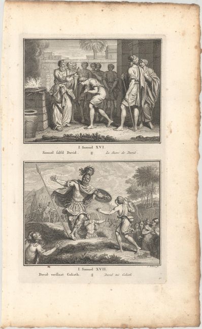 Nice lot of copper engraved illustrations from the Old Testament depicting various scenes from the First Book of Samuel. Illustrations include David defeating Goliath, Saul hurling a spear at David, and Eli's death upon hearing the news that the Ark of God has been captured. There are two scenes (7 x 5.3") on each sheet. They are from a Dutch biblical history by Ysbrand van Hamelsveld.