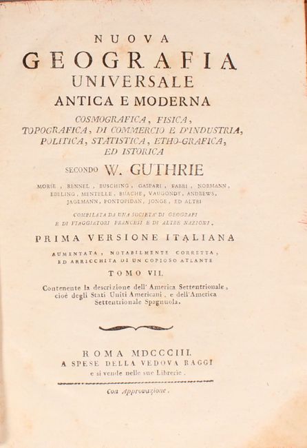 This is Volume VII of the Italian edition of Guthie's Geography covering North America. There are individual chapters on each of the U.S. states and territories, including Vermont, New Hampshire, Maine, Massachusetts, Rhode island, Connecticut, New York, New Jersey, Pennsylvania, Delaware, Ohio, Maryland, Virginia, Kentucky, North Carolina, South Carolina, Georgia, and Tennessee. There are also chapters on Spanish claims, such as Florida, California, and Mexico. This volume includes two maps: