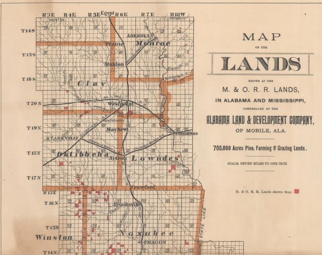 This very uncommon folding map depicts lands controlled by the Alabama Land and Development Company along the Mississippi-Alabama border. Mobile and Ohio Railroad lands are shaded in red. Counties and cities are named, and there is some navigational detail in the Mississippi Sound and Mobile Bay. Printed by Woodward & Tiernan in St. Louis.