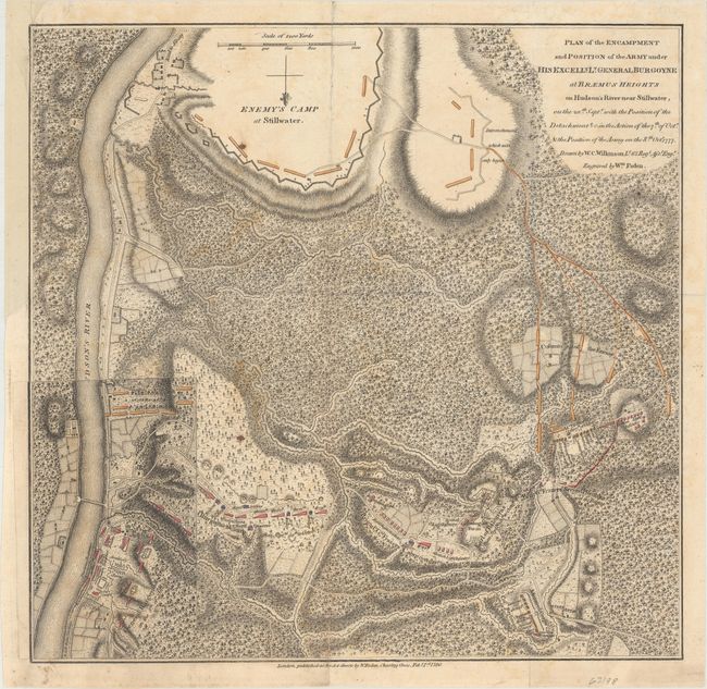 This detailed and uncommon battle plan shows the placement of British and American forces during the second Battle of Saratoga (also known as the Battle of Bemis Heights), which took place in October 1777. The two battles were fought nineteen days apart, and the interesting overlay at bottom left shows the change in positions of the two armies over that time period, with the Americans advancing north (with north oriented to the bottom). These overlays were located at the end of the atlas and could be hinged to the map. Saratoga was a key victory for the Americans, leading to an alliance with the French that brought critical military aid. The map uses hand color to depict the troop positions and is from John Borgoyne's A State of the Expedition from Canada..., published in London. Faden's maps of the American Revolution are particularly well presented because he based them on manuscript maps supplied to him from the war zone.