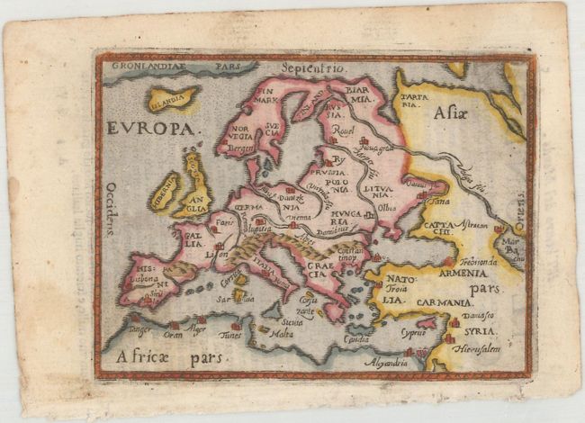 This charming miniature map of Europe extends east to the Caspian Sea and includes a partial coastline of Greenland at top. Detail is limited to key rivers and cities. Italian text on verso.