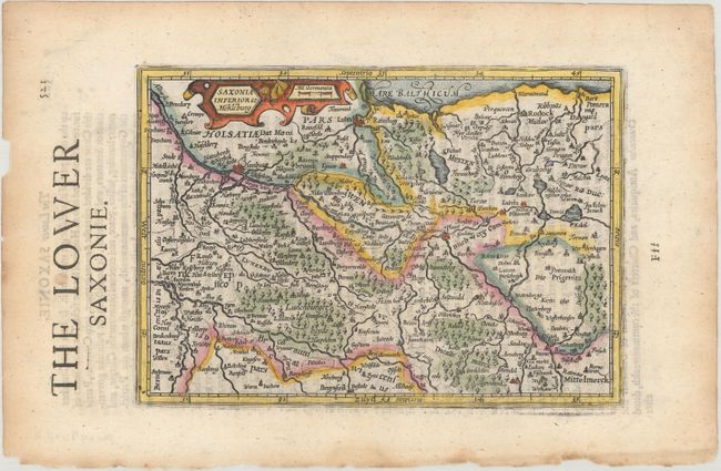 This matching pair of maps comes from the English edition of Mercator's Atlas Minor, which was published under the title Historia Mundi or Mercators Atlas by Michael Spark and Samuel Cartwright. After acquiring the plates to the 1607 edition of the Mercator/Hondius Atlas Minor, Sparke republished the maps with text translated into English by Wye Saltonstall. Sparke also had 41 additional maps engraved for the Historia Mundi. Most of these maps were copied from Cloppenburg's edition of Atlas Minor and are therefore a bit larger, with some signed by the engravers Jacob van Langren and Ralph Hall. These additional maps only appeared in the 1635, 1637 and 1639 editions of the Historia Mundi and are therefore quite scarce. Included in this lot are two maps of northern Germany, including one of the newly engraved maps. Each map is adorned with a decorative title cartouche and a distance scale. English text on verso. Sizes vary slightly.