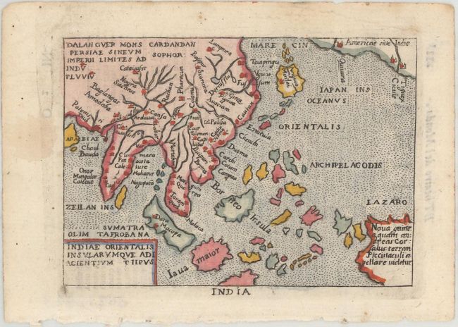 This miniature version of Ortelius' important map of Southeast Asia shows how sketchy the available information was concerning the region. The East Indies are presented as a randomly scattered group of islands with Java and Borneo particularly misshapen. Japan is presented in its kite-shaped form, and in the upper right corner America makes an appearance with three cities: Quivira, Cicuie, and Tiguex. Italian text on verso.