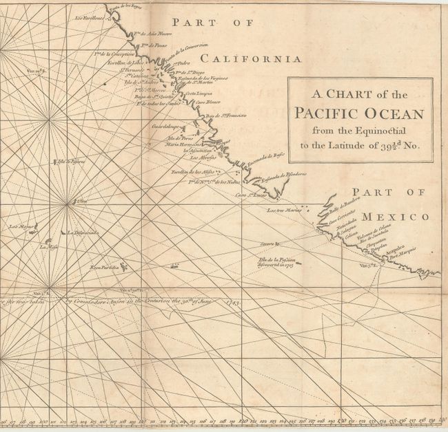 Unusual chart on two joined sheets detailing the route of Spanish galleons between the Philippines and Acapulco. The tracks of British Navy Commodore George Anson and Spanish Nostra Seigniora de Cabadonga are shown. A somewhat speculative depiction of the islands of Japan is shown at top left. Engraved by R. W. Seale. This chart appeared in Anson's account of his circumnavigation, compiled by Richard Walter and Benjamin Robbins, and first published in 1748.