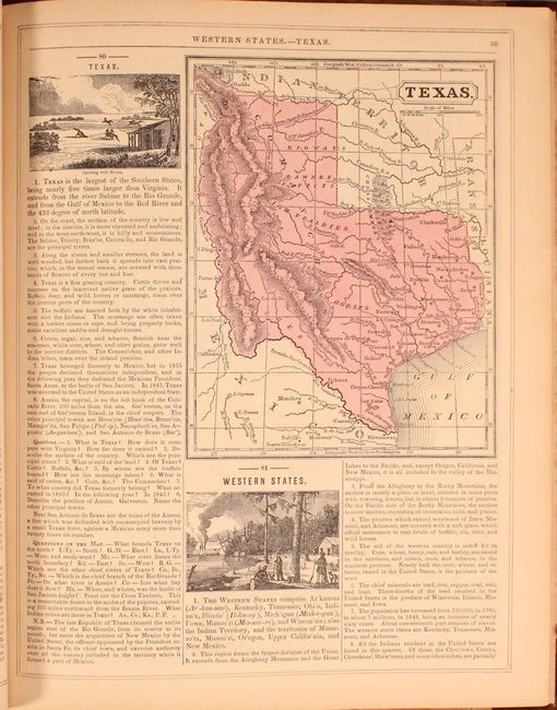A. A System of Modern Geography, Comprising a Description of the Present State of the World..., published 1850, (10.3 x 12.5"). This complete example of Mitchell's Geography was published for "the instruction of Youth in Schools and Families." It is richly illustrated with wood engraved vignettes, diagrams and statistics. It includes maps of America, Europe, Asia, Africa, Oceanica, and all of the states and territories of the United States. This fine geography contains 40 hand-colored maps, several U.S. maps with unusual western boundaries, an elaborate frontispiece describing the Comparative Height of Mountains, and six pages of amusing advertisements. The map of Texas shows the state in its largest configuration, circa 1846. The map of the west contains only Upper or New California, which occupies all of the Southwest, and a large Oregon Territory extending west to the Continental Divide, plus more. Hardbound in 1/2 leather and pictorial boards, frontis, title page, preface, contents, engravings and maps, advertisements, 80pp. Condition: Binding is good, with new leather spine and tips to repair partially separated covers. There is an area of toning on new spine from a non-archival label that has since been removed. Text and maps generally good, with light toning, minor scattered foxing, and some dog-eared pages. First blank endpaper has several lines of manuscript in ink. (B+)